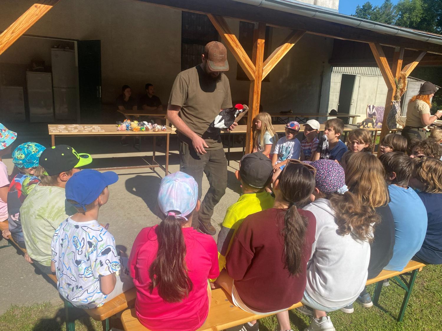 Po přespávání ve škole a večerní bojovce jsme následující den v pátek 21. června vyrazili na mysliveckou chatu. Zde byl připraven pestrý program pro děti, tentokrát i s přednáškou od Lesů ČR.